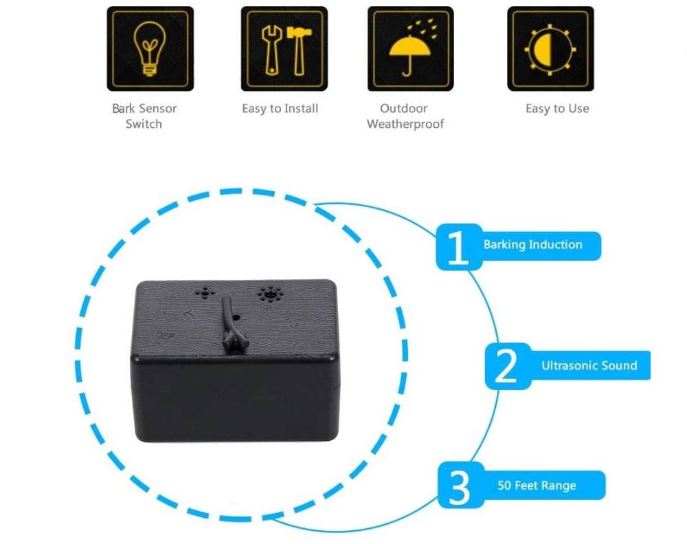 The outdoor bark control emits an ultrasonic sound. The ultrasonic sound can be heard by dogs but is silent to humans. Startled by the high-pitched sound that is safe and effective, the dog should stop barking, it will associate its bark with this unpleasant noise. When the dog stops barking the ultrasonic sound also stops. The outdoor bark control has 3 range levels and a test mode. It is effective up to 50 feet.